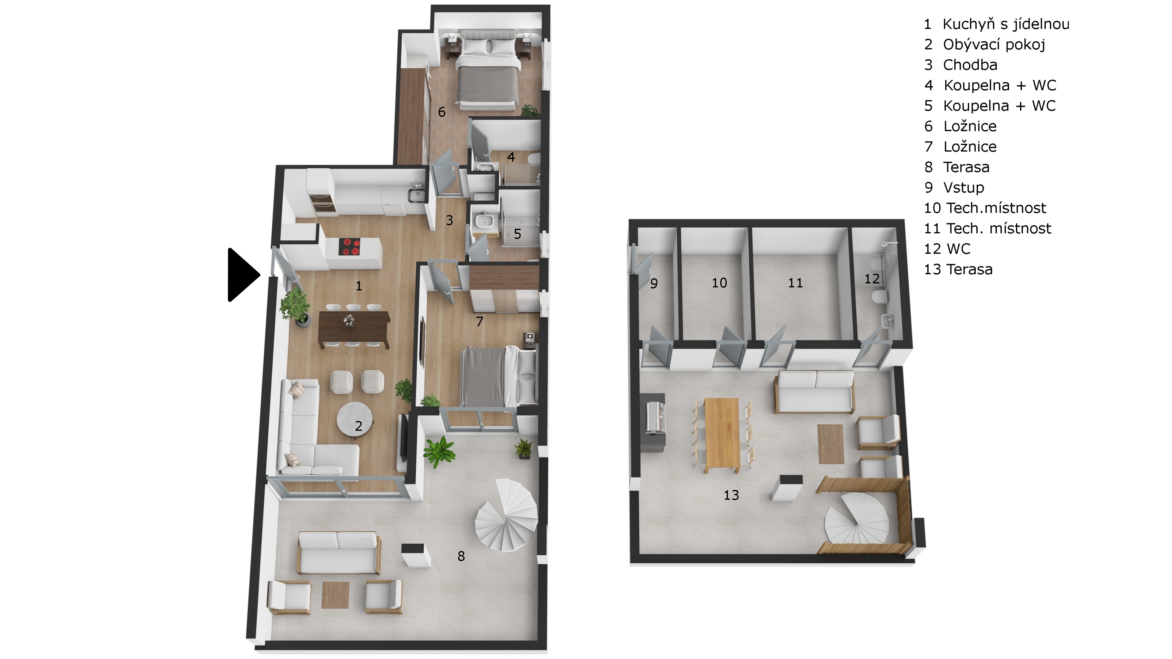 Tento apartmán 3+kk s celkovou výměrou 176,5 m² se nachází ve třetím patře a má vše, co potřebujete k pohodlnému životu u moře. Samotná obytná plocha 79,1 m² působí útulně a prakticky i díky dvěma koupelnám. Skutečným bonusem je soukromá střešní nekrytá terasa 40,4 m² s velkým úložným prostorem a samostatnou toaletou (19,4 m²) , kam se dostanete po točících schodech ze své 34,2 m² velké terasy s přístupem z obývacího pokoje. Jde o prostory, kde můžete snídat, večer grilovat a po celý den jen tak odpočívat. Navíc získáte vlastní úložný prostor 3,4 m² a jedno garážové stání v přízemí domu.